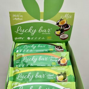 Lucky bar NARANJA:Pasta de dátiles *, copos de avena sin gluten*, coco*, algarroba*, naranjas deshidratadas*, sirope de agave oscuro* y sal*. Puede contener trazas de frutos de secos y semillas de fruta. Contenido: 3 barritas sabor naranja de 40g